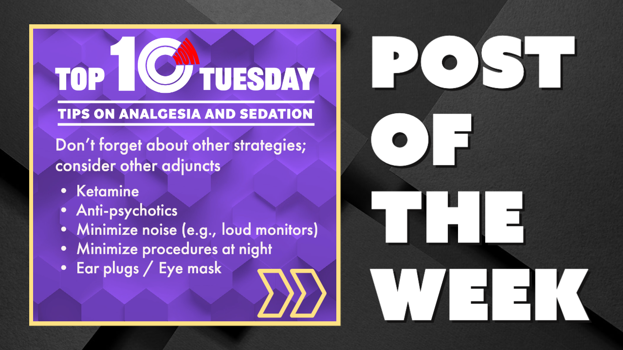 In the last post, I talked about something that everyone who manages critically ill patients should know about, analgesia and sedation. This practice is sometimes under appreciated but has huge implications in the morbidity and mortality for our patients. 10 slides is certainly not enough to cover this topic, but these are the top 10 things that I believe can help you with your patients. Here's the link to the post.