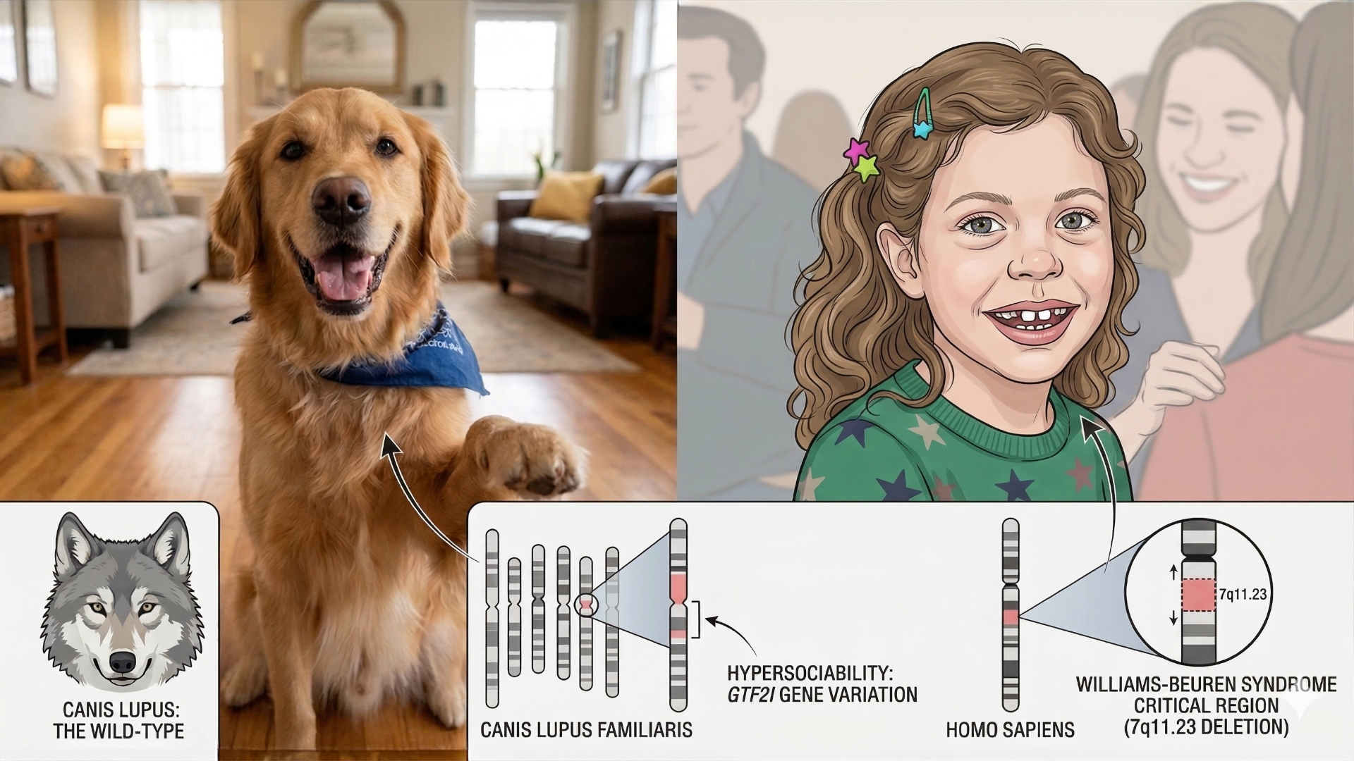 The parallel in humans is striking. Williams Syndrome (WS), typically caused by a microdeletion on chromosome 7, produces a characteristic profile of hypersociability, heightened empathy, "elfin" facial features, cardiovascular anomalies, and mild-to-moderate intellectual disability. Individuals with WS show a near-complete absence of social fear—they approach strangers readily and form immediate emotional connections, often at the cost of appropriate social caution. Dogs show a remarkably similar behavioral signature: reduced stranger-avoidance, prolonged gaze toward human faces, and a strong drive for social contact that persists even when no food reward is offered. Both populations also show parallels in cognitive profile, with relative weaknesses in spatial reasoning and problem-solving alongside preserved or heightened social cognition. The comparison suggests that what we call "Man's Best Friend" behavior isn't simply a product of training or shared history—it's a hypersociability phenotype that appears to have been positively selected during domestication, with the same genomic region driving convergent social behavior across two very different species.